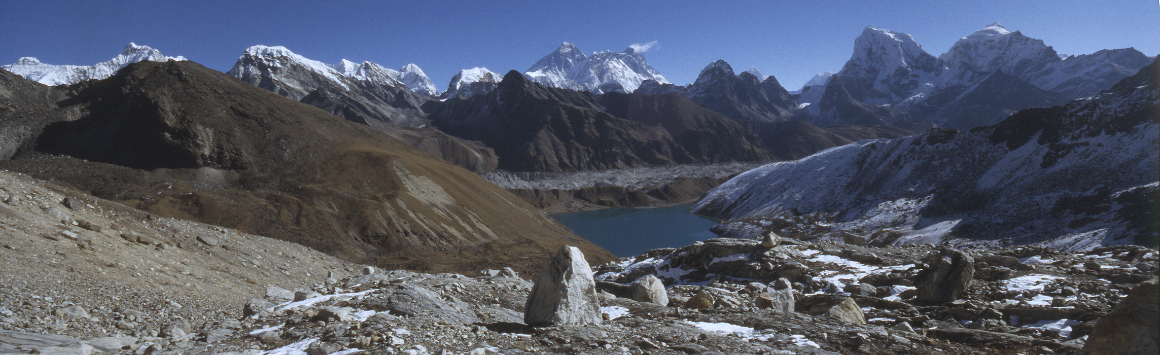 Im Tal von Gokyo wälzt sich von den Südhängen des Cho Oyu der große Ngozumpa Gletscher zu Tale. Zwischen Berghang und der mächtigen westlichen Seitenmoräne ist eine Reihe von 5 Seen