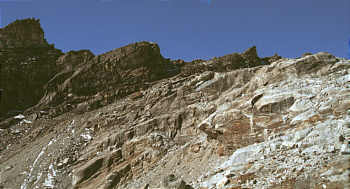Hier sieht man auch gut das “gelbe” Band im oberen teil des Gipfels. Es handelt sich um Sedimentgesteine die ursprünglich am Meeresboden des Tetysmeeres lagen und die noch immer Fossilien enthalten. Wie die