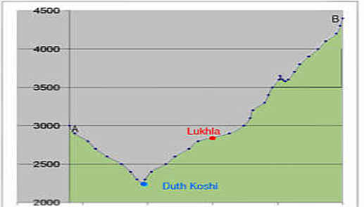 Das Höhenprofil vom Duth koshi Tal, Die Landebahn von Lukla ist auf einem etwas flacheren Teil des Hanges Gebaut, danach geht es gleich wieder steil hoch.