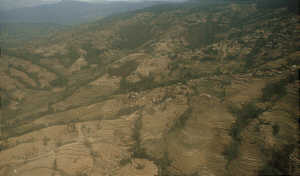 Über Hügel mit vielen Terassenfeldern, Pässe die oben voller Wald sind und in der Ferne die Himalaya Berge fliegt man eine gute halbe Stunde Richtung Osten - dann ein Schwenk nach Norden um dann