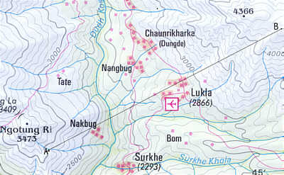 Der Kartenausschnitt von Lukla. Die Linie von A nach B entspricht dem Höhenprofil oben.
