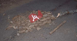 quer über die Straße gebaut. So putzig dass man es in 5 Minuten hätte wegräumen können. Wäre da nicht das kleine rote Tuch als Warnung von einer Bombe gewesen. Bachan und ich wussten sehr genau, dass