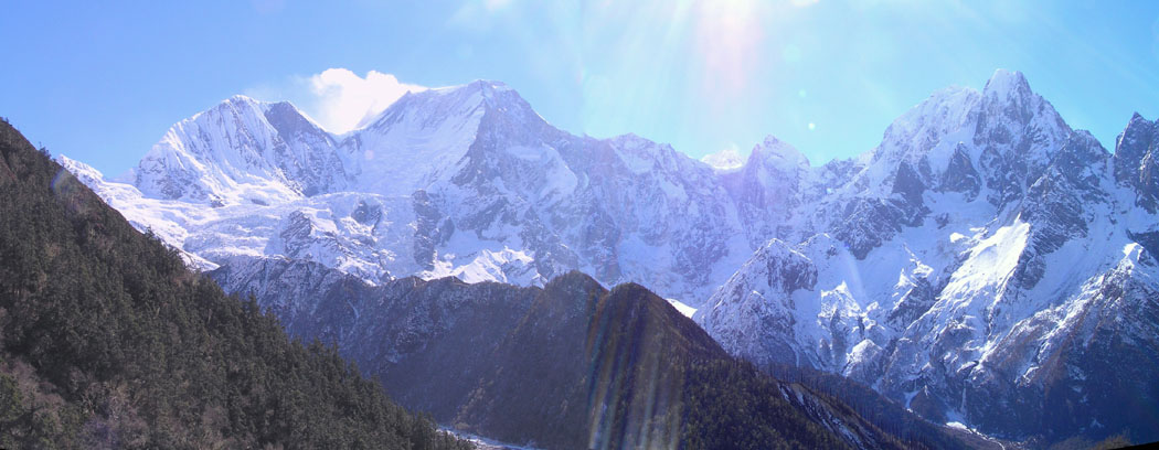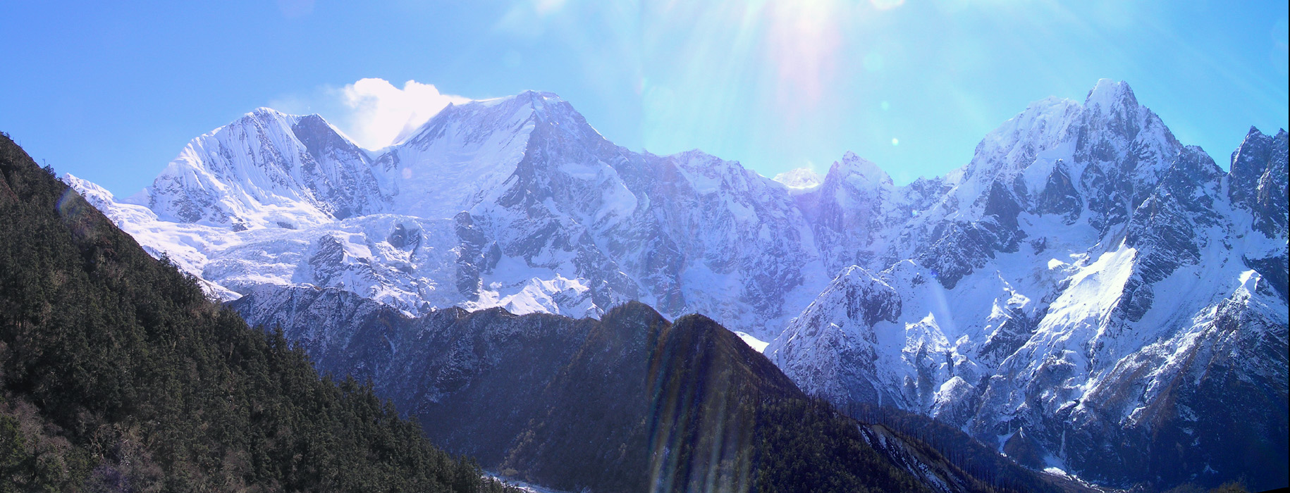 Das Manaslupanorama. Der zweite Berg von links ist er. XXL Bild zum scrollen mit 1800x700 Pixel als wir dann auf der anderen Seite der Moräne herunterstiegen waren wir plötzlich in eine vollständig anderen Welt. Waren wir die letzten 4 Tage in frostigem und winterfarbenen Gebiet mit wenig Vegetation gelaufen, so waren wir plötzlich in einem warmen, duftendem Wald in den lieblichsten Grüntönen. Oh wie wohlig war das.