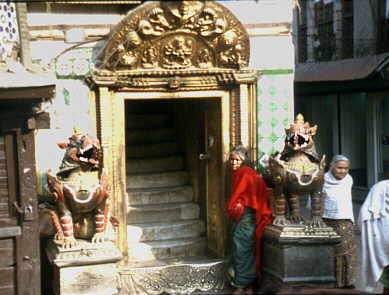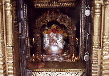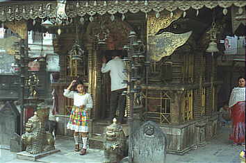 eine Form von Shiva ist. Dieses große Gebäude dominiert den ganzen Indra Chowk. Es ist ein mit farbigen Kacheln und viel Messing geschmückter Tempel. Der eigentliche Tempel