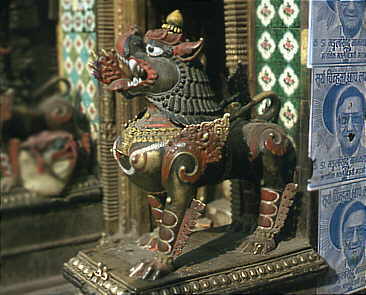 vorbeigekommen ist erreicht man den Indra Chowk. Hier steht der Akash Bairawa Tempel (2). Meist vergeblich probierten die