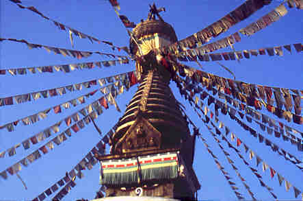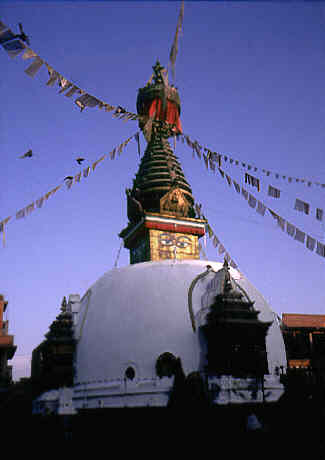 ist eine kleine Kopie des Stupa von Swayambunath und wer nicht die vielen Stufen zum letzteren hochsteigen kann, der kann auch hierher kommen. Abends kommen manchmal