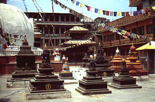 Bhotias und Tibeter, die hier in Kathmandu ihre Felle und Wolle verkaufen. Rund um den Stupa sind viel kleine Statuen aufgestellt und hinten am Platz gibt es ein kleines Kloster.