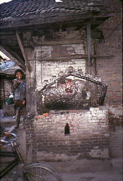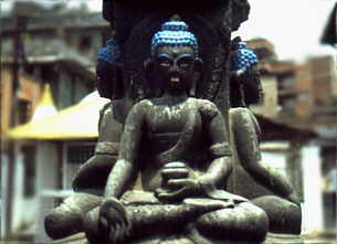 bekommt man Gebetsfahnen, Stoffe usw., übrigens meist preiswerter als am Boddnath. Hier führt eine kleine Seitengasse auf den Platz mit dem schönen Stupa Kathesimbu. Er