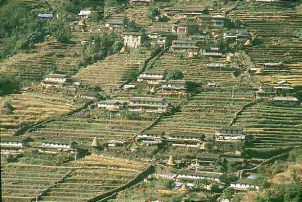 Die Häuser sind zwischen den terassierten Feldern verstreut, links oben geht der Treppenweg hoch