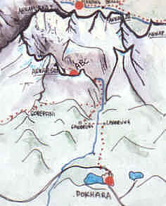 früh am Morgen geht. Dies gilt insbesonders auf dem 2 Stundenweg zwischen Deorali und dem MBC. Bei Lawinengefahr sollte man hier nur in den ersten Morgenstunden gehen und spätestens