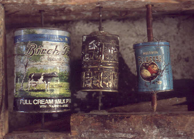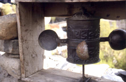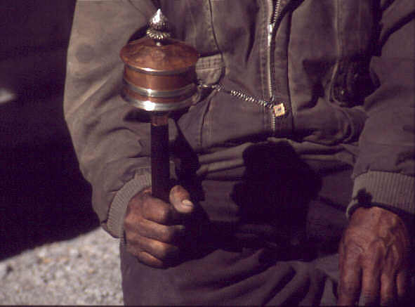 Die tragbaren kleinen Gebetsmühlen werden noch immer von vielen Leuten mitgenommen und durch eine leichte Handbewegung zum Drehen gebracht. So kann man die gute Tat