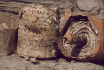 An diesen alten Gebetsmühlen aus Tukuche kann man die aufgewickelten Gebetsseiten erkennen, die allerdings schon arg vom Zahn der Zeit zerzaust worden sind.