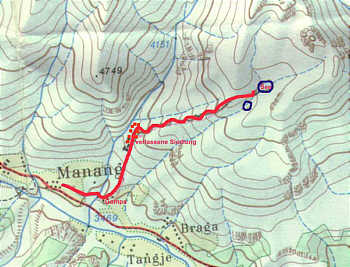 Von Manang den Weg bei der Post vorbei nach Osten, kurz absteigen ins Flussbett und gegenüber wieder hoch zur kleinen Gompa (thront markant auf einem Rücken).