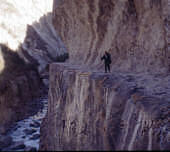 senkrechte Wand gehauenen Pfad nach Norden. Hier haben die Gletscher eine riesige, glattpolierte und 2000 m hohe Steilwand hinterlassen, die in einer riesigen Kurve in