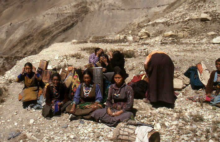 Die Prozession hält kurz an, im hintergrund sieht man den Thorong La
