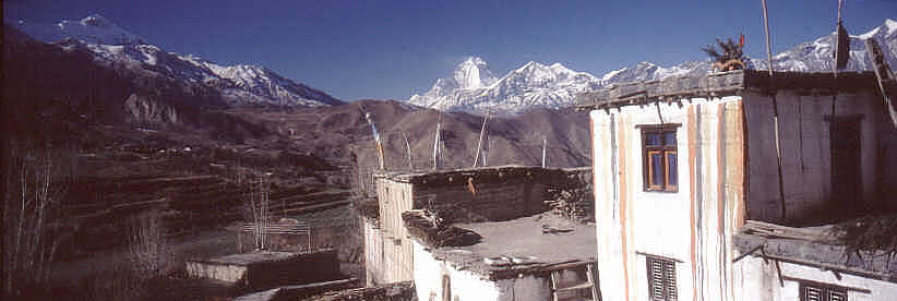 Das Dorf Chaingur mit seinen bemalten Häusern, im hintergrund der Daulagiri