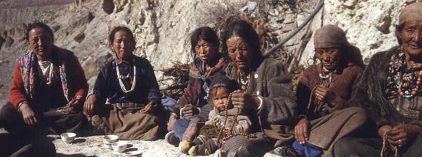 Die Frauen von Dzong beim gemeinsamen Beten, als ein hochrangiger Lama in das Dorf gekommen war.