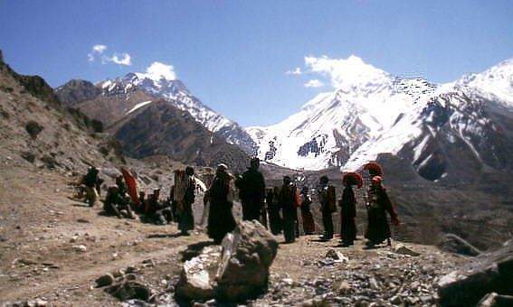 Die Prozession hält kurz an, im Hintergrund sieht man den Thorong La