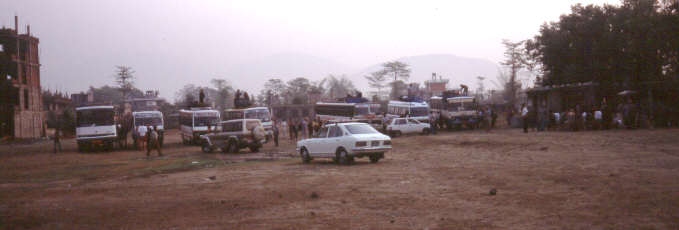 fast immer mit Verspätung so gegen 7 Uhr weggefahren, da jedes mal einige Mitfahrer zu spät kommen. Diese Busse sind Touristenbusse und teurer als die nepalesischen. Die