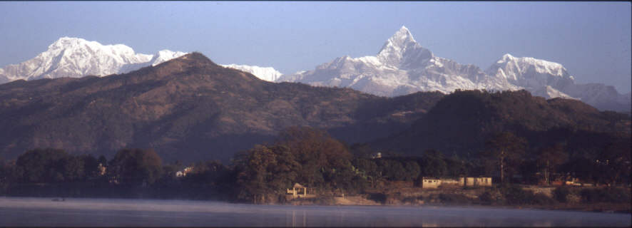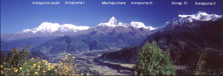 Vom Aussichtshügel Sarangkot hat man eine sehr schöne Sicht auf das ganze Annapurnamassif. Besonders schön ist es, wenn man zum Sonnenaufgang mit dem Taxi hochfährt