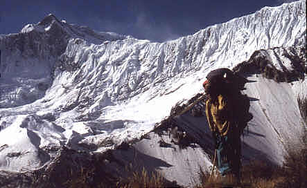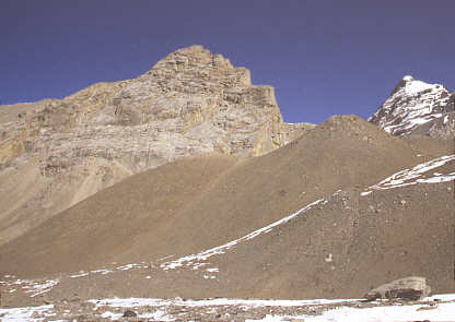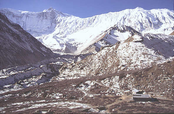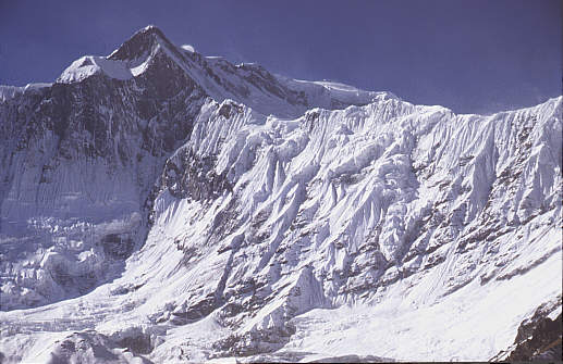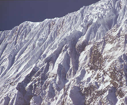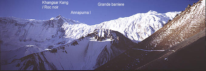 noir (schwarzer Felsen), wie ihn die Franzosen benannt haben. Er ist so steil, dass kein Schnee hängen bleiben kann. Oben sieht man den Grat der dann zur Annapurna 1 weiterführt