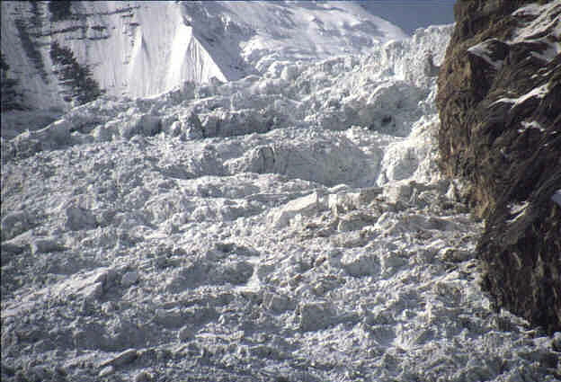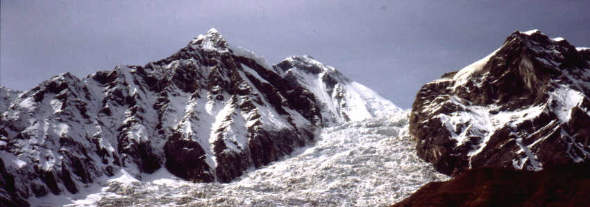 der Mitte gehört zum Baraha Shikar (auch Feng genannt), auf der rechten Bildseite ist die Annapurna Süd. Zwischen den zwei Gipfeln liegt ein riesiger Eispanzer.