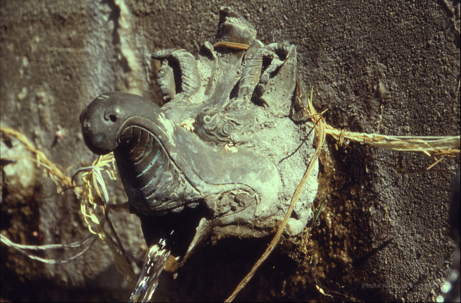 Im oberen Teil läuft eine Mauer um den Tempel, in dem aus 108 bronzenen Tierköpfen Wasser aus der heiligen Quelle läuft. 108 ist wiederum eine im Buddhismus relevante Zahl.