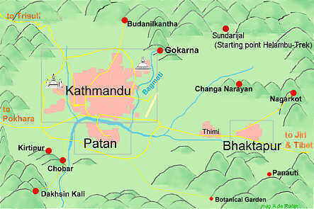 Bagmati is able to go south on its way to the Ganges. Twenty years ago, the fields begun just on the edge of Kathmandu, but nowadays nearly the whole valley is full of houses, and the little villages grew to little