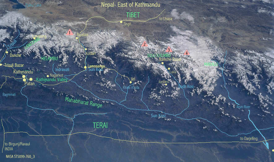 In this enlargement you see the main trekking areas of Helambu, Langtang and Solu Khumbu ( Everest). Even from space one can seethe ridges which have to be climbed on the way from Jiri to Namche Bazar. mountains: