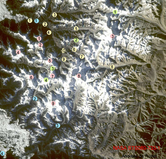 Everest+Lhotse+ Nuptse; 9 Makalu green-cols : 1 Nagpa La; 2 Cho La; 3 Amphu Laptsa; 4 West col Blau-Flüsse: 1 Dudh Kosi; 2 Barun; 3