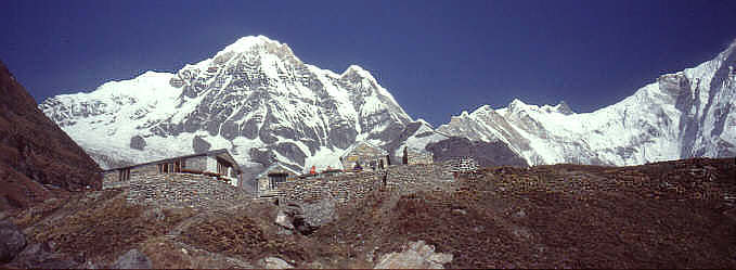 Machapuchare Base Camp (3700m). Many people will sleep here in one of the 5 lodges to