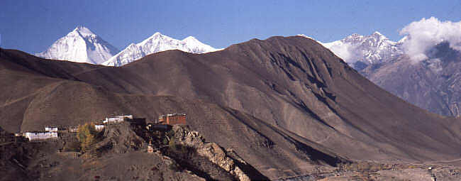 Jharkot with its typical red Gompa (monastery) is situated on a hill. In the back you see the Daulagiri and the Tukuche peak.