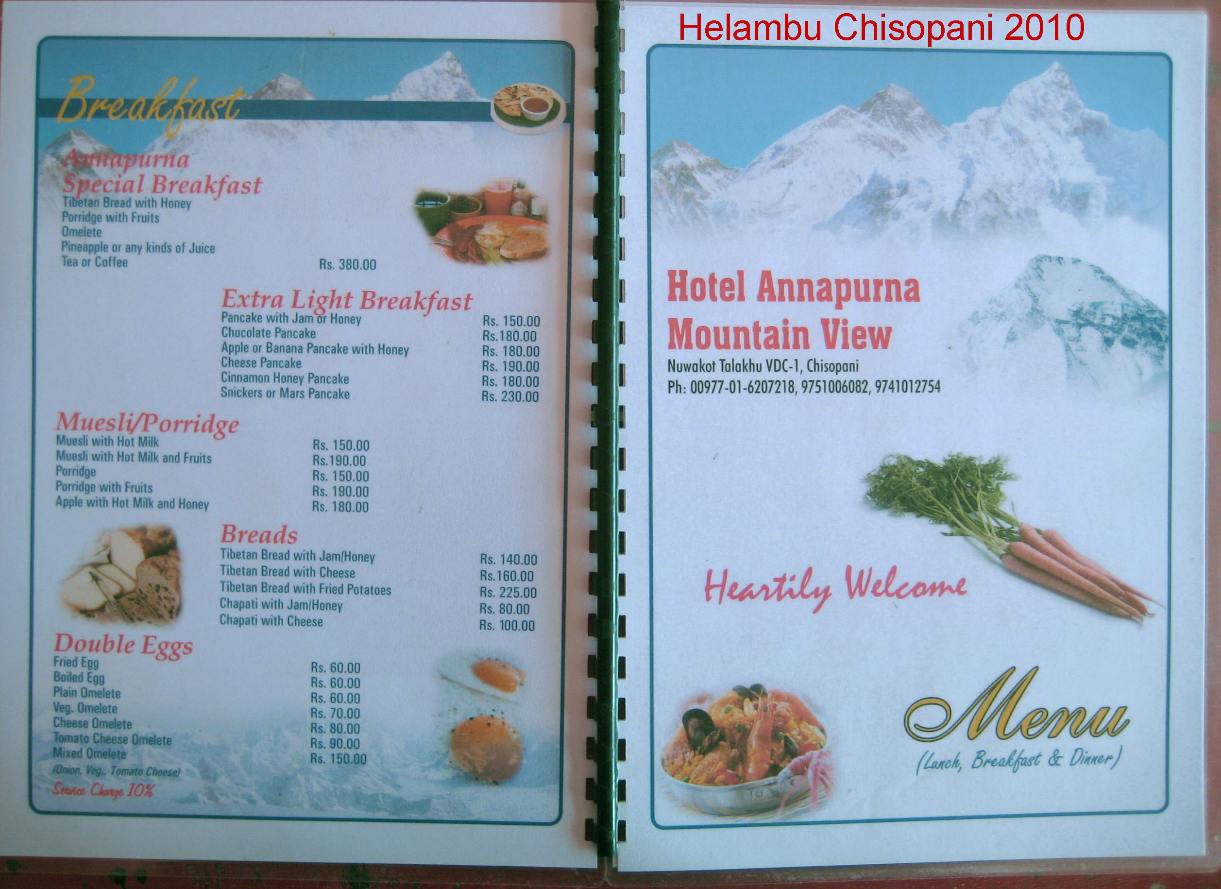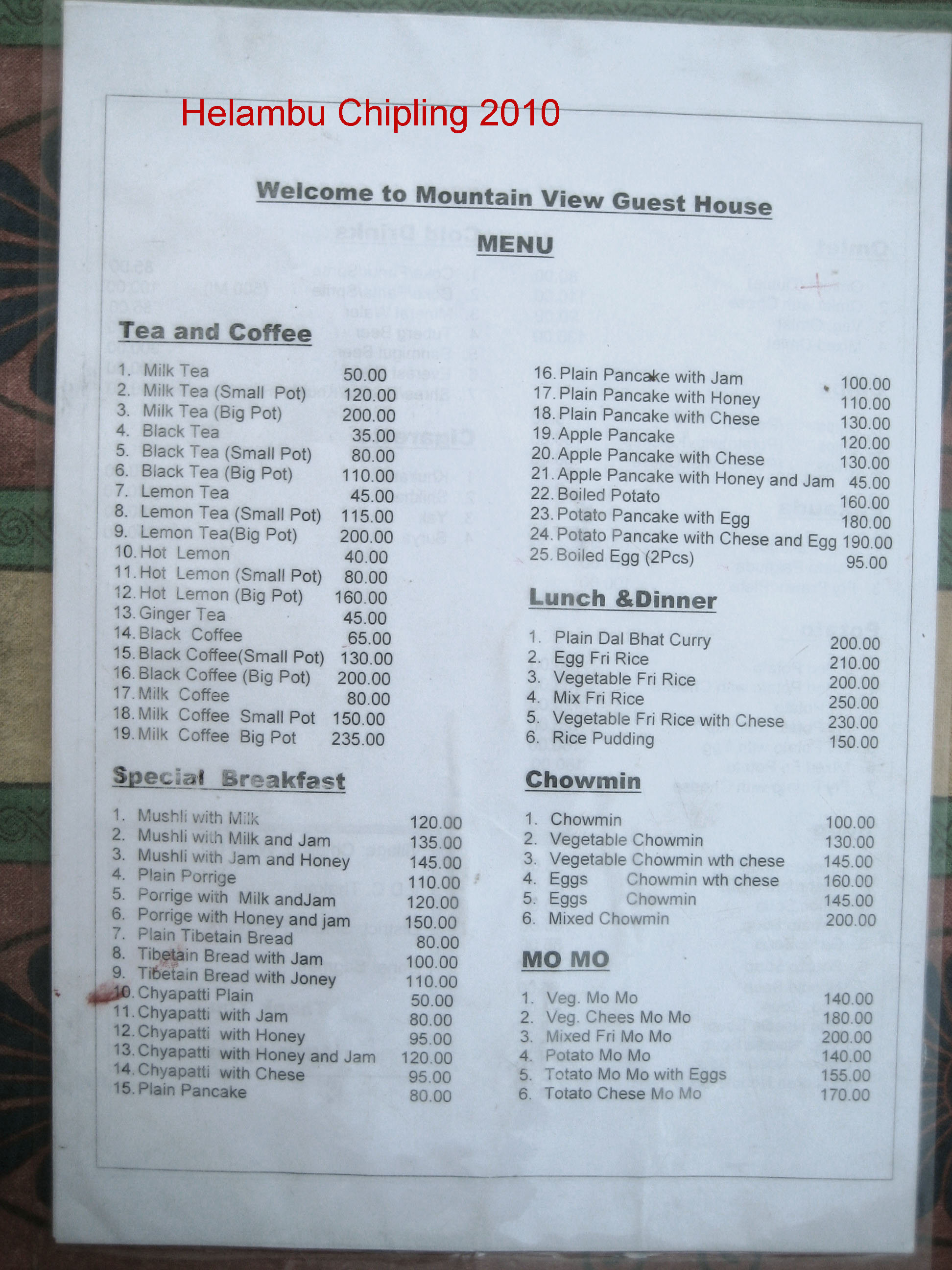 Ab 2010 würde ich gerne regelmäßig Fotos von Menükarten aus den verschiedenen Trekkinggebieten auf meiner Webseite veröffentlichen. Denn dann kann jeder sich ein Bild machen, wie viel er ungefähr ausgeben wird. Aber