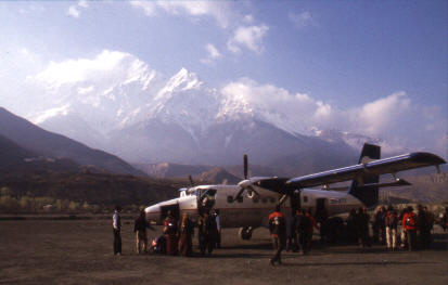 Bild: Mit dem STOL Flugzeug nach Jomsom Nach der Freigabe von nationalen Fluggesellschaften wurden viele neue Gesellschaften gegründet. Einige sind aber auch mittlerweile wieder eingestellt worden. Von den Touristen werden am meisten Flüge nach Lukhla, Jomsom und Pokhara gebucht. Zu diesen Plätzen fliegen direkt mehrere Airlines, so dass es fast immer recht schnell einen freien Platz gibt. Ein Flug kann in Nepal ein großartiges Erlebnis sein, fliegt man doch fast immer dicht an den großartigen Bergen vorbei. Insbesonders auf den Flüge in die Berge ist es aber auch ein richtiges Abenteuer und man fühlt sich in die Zeit der “fliegenden Kisten” zurückversetzt. Bei Turbulenzen wird man dann ganz gehörig durchgeschüttelt. Spannend ist der Flug auch , weil der Pilotenspruch: “Das gefährliche an den Wolken in Nepal ist, dass sie voller Steine sind” wirklich zutrifft. Man fliegt meistens im Tal unterhalb der Gipfel und überquert dabei die gleiche Pässe, die man auch als Trecker überschreitet. Es ist keine Seltenheit, dass man beim Trecken auf den hohen Wegen, die Flugzeuge viel tiefer unten im Tal fliegen sehen kann. Flüge bei den nationalen Gesellschaften kann man zum Teil von hier aus buchen. In Kathmandu oder Pokhara kann man aber auch problemlos zu einem der hunderten Reiseagenten gehen, diese verkaufen normalerweise Tickets von allen nationalen Fluggesellschaften. Wenn nicht gerade das Wetter Flüge zu einem der Trekkinggebiete verhindert, bekommt man meistens innerhalb von 1-2 Tagen den gewünschten Flug. flüge von und nach Lukla fallen manchmal wetterbedingt für mehrere Tag aus. Eine gute Übersicht der nepalesischen Fluggesellschaften finden sie bei Nepalvista.oder http://www.manang.com/international_domestic_daily_flight_schedules/index.php In Kathmandu kostet ein Taxi vom Flughafen in die Stadt ca 8-10 Euro ( Stand 2019) ich empfehle die Buchung direkt im Flughafen als Prepaid Taxifahrt. weiter zu den Unterseiten: Reisezeit Gesundheit Reise-Versicherungen Flüge Reiseveranstalter Reiseplanung Ausrüstung Foto Budget Essen &Trinken Reiseberichte Visa Träger Verschiedenens Rafting